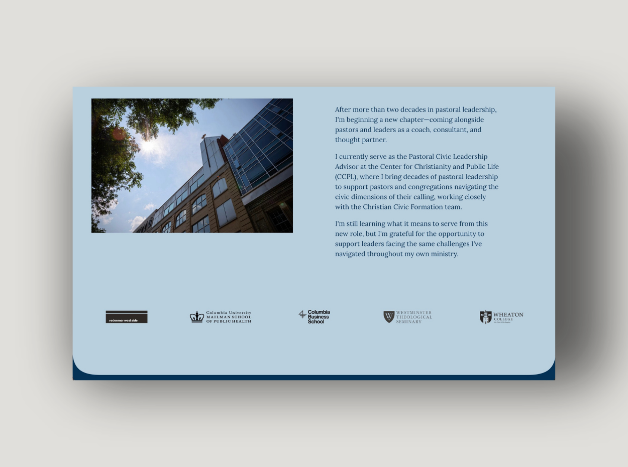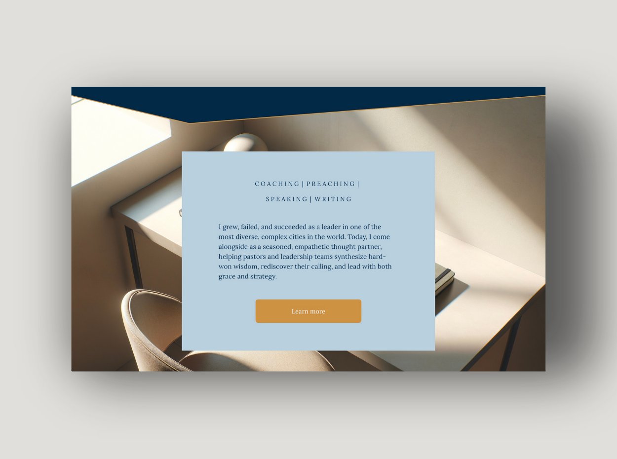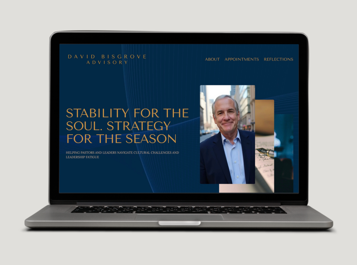 Every element—from the logo to the business card to the website—conveys steadiness and warmth, mirroring David’s mission to help pastors and leaders navigate cultural complexities and overcome leadership fatigue. The brand evokes stability for the soul and strategy for the season—a modern yet timeless expression of grounded support and a clear path forward rooted in wisdom.